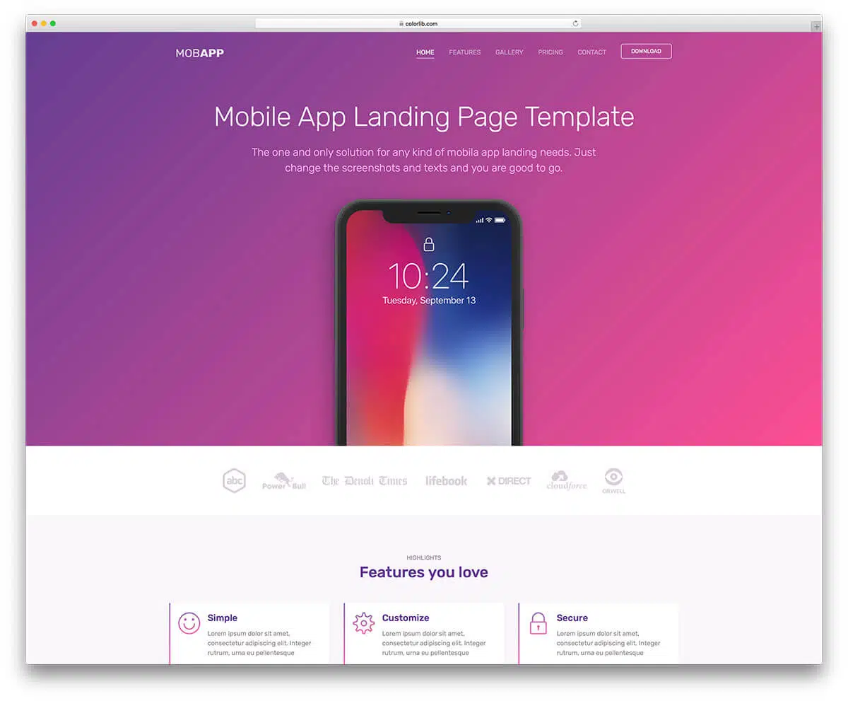 Si vous recherchez un modèle de page de destination gratuit pour la version de votre application mobile, jetez un coup d’œil à MobApp de Colorlib. Il regroupe tous les éléments de design épurés des conceptions de page Apple et de l’App Store auxquels les gens sont habitués. En l’absence de distraction, votre application mobile occupe une place centrale dans cette conception et vous permet de travailler avec un certain nombre d’options de CTA et d’abonnement. Ce modèle est compatible avec les solutions d’abonnement modernes telles que Stripe Checkout ou Paddle, de plus en plus utilisées pour la gestion des paiements récurrents. Vous pouvez également ajouter des témoignages, des FAQ et d’autres fonctionnalités pour augmenter l’engagement et augmenter le taux de conversion de votre site web grâce à de nombreux tests A/B, désormais facilités par des outils modernes comme Google Optimize (remplacé progressivement par des solutions comme VWO ou AB Tasty).