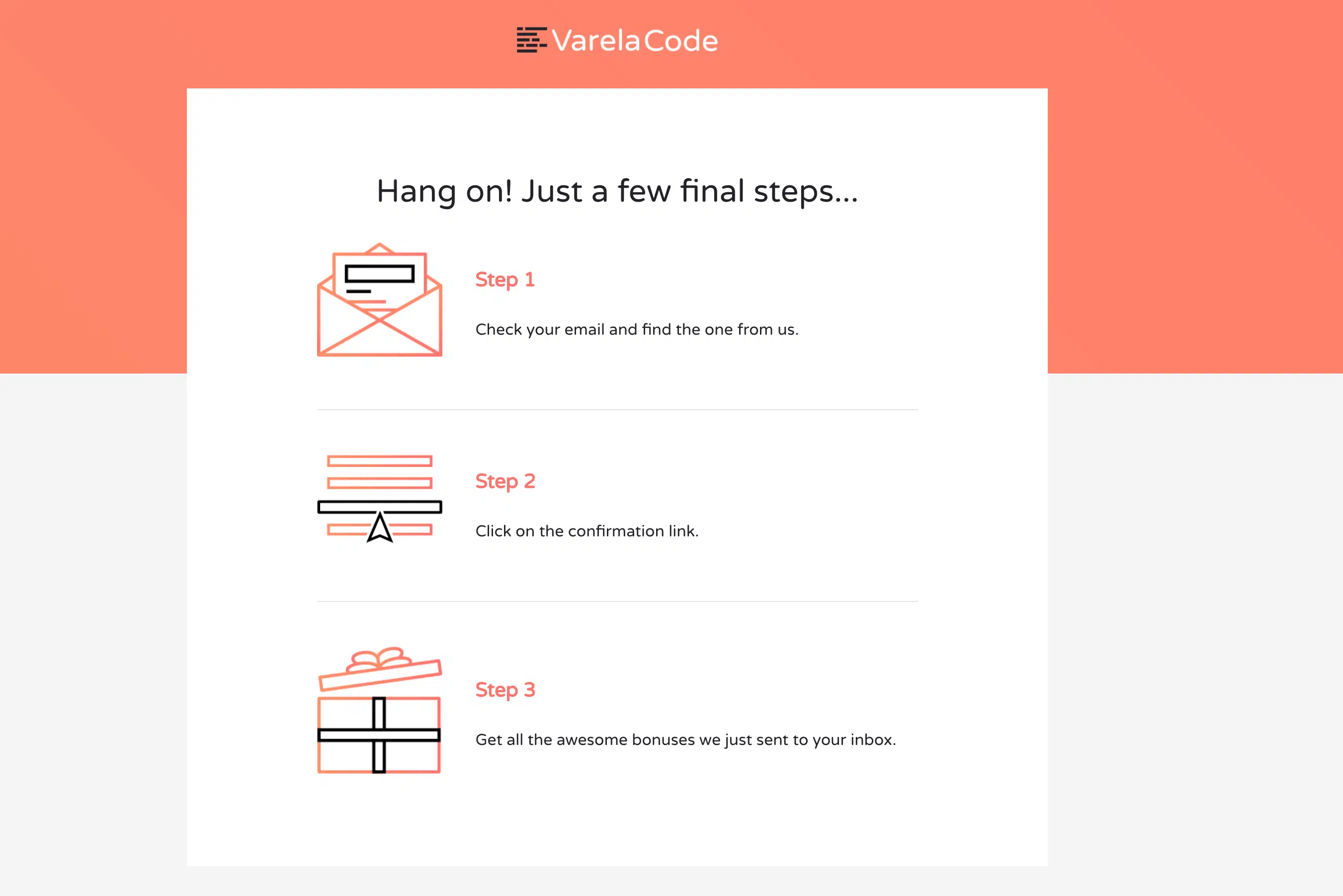 VerelaCode est un modèle de landing page à double acceptation proposé par des plateformes comme Leadpages, mais aussi par des solutions modernes telles que ConvertKit ou MailerLite, qui facilitent la gestion de l’opt-in et de la délivrabilité. Cela vous permet de leur expliquer exactement ce qu’ils doivent faire pour confirmer leurs informations et vous assurer qu’ils reçoivent tous les avantages promis en retour de leur adresse email. Cela réduit le nombre d’adresses électroniques incorrectes ajoutées à votre liste et le nombre d’échecs d’envoi, ce qui est important pour toute stratégie de marketing par email. Encore une fois, ce modèle est gratuit, mais vous devez être un client de Leadpages pour y accéder. En retour, vous obtenez une bibliothèque de modèles de landing page conçus avec des objectifs de conversion spécifiques.