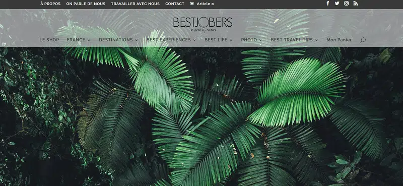 Lauréats d’un concours pour faire le tour du monde, Elisa et Max ont décidé de partager leur expérience du voyage. Résultat ? Un blog de voyage original, introduit par une somptueuse photo prise dans le désert du Nevada. On note la calligraphie utilisée pour écrire le nom du site, qui met en valeur la dimension et le réseau Instagram. Du désert américain, on clique et on passe à une photo de feuillage où le vert domine : la variété des couleurs est un vrai parti pris qui prend son sens dans un blog voyage. Par ailleurs, il y a peu de texte sur la homepage, ce qui correspond à l’identité choisie.