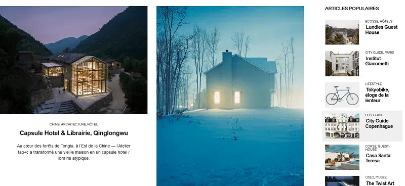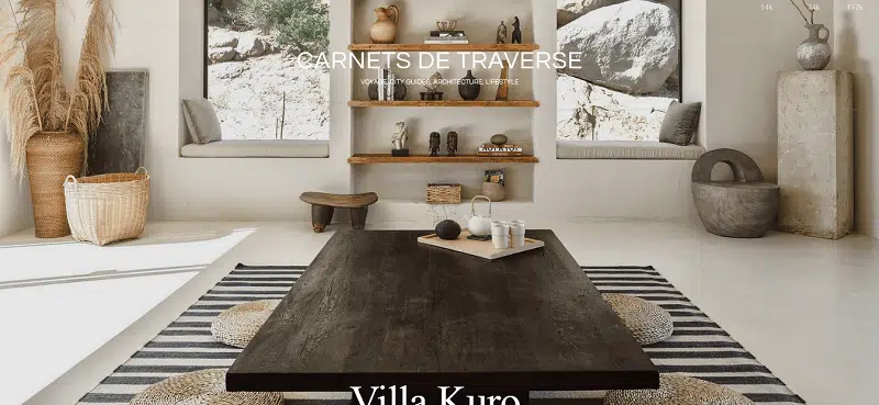 Le blog Carnet de Traverse a été créé en 2008 par Julie et Renaud. Celui-ci a décidé de poursuivre courageusement le développement du blog après le décès de sa compagne en 2017. Ce blog de voyage a une identité orientée lifestyle et excursions haut-de-gamme, avec des images d’hôtels à l’architecture moderne, et le design du site qui correspond. En homepage, à mesure qu’on déroule, on trouve une organisation verticale réfléchie entre grande image et images moyennes. Cela donne du rythme à la page et embellit son design.