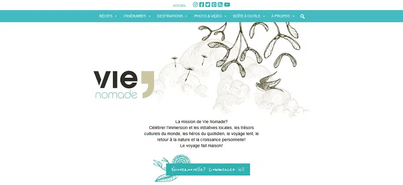 C’est à partir d’un voyage d’un an en solo qu’Adeline, responsable dans la publicité, change de vie et créée son site de voyage. Sur Vie Nomade, le ton est donné : place au « slow voyage » où l’on prend son temps. Le site est introduit par un dessin figurant une hirondelle et des nuages. Plus bas, on découvre un projet de carnet de voyage numérique, où l’auteure nous parle de ses voyages en train vers des destinations inattendues.
