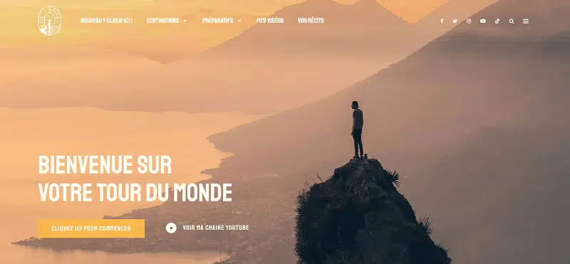 Bruno Maltor est sans conteste le jeune bloggeur voyage le plus populaire sur YouTube. Avec des vidéos atteignant régulièrement les millions de vues, il a su se démarquer sur la plateforme. D’ailleurs, son blog tire parti de son savoir-faire photographique. En effet, la landing page accroche l’oeil avec une image du bloggeur juché sur un rocher, au dessus d’une somptueuse baie plongée dans un soleil couchant. L’usage du drone est de rigueur et permet d’immerger le visiteur dans un univers. Le déroulé de la page permet de retrouver des images grand format et du texte avec modération, dans un juste équilibre.