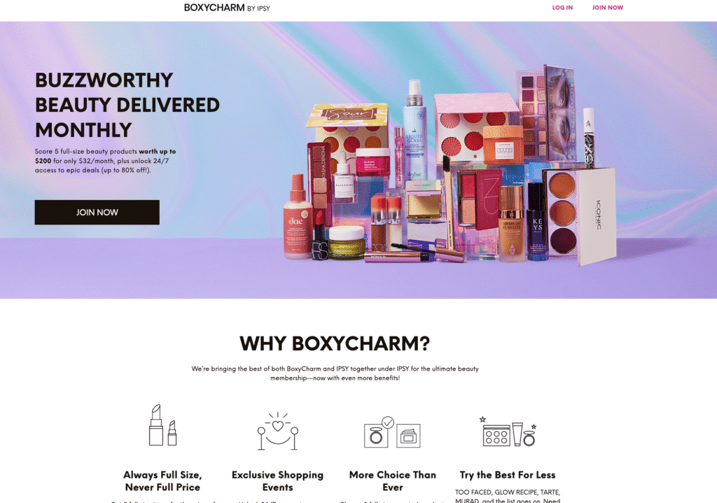 La landing mise tout sur la narration : teaser visuel, promesse claire (“3 cosmétiques + 3 accessoires”), prix rond (19,90 €/mois) et zéro friction à l’abonnement.
