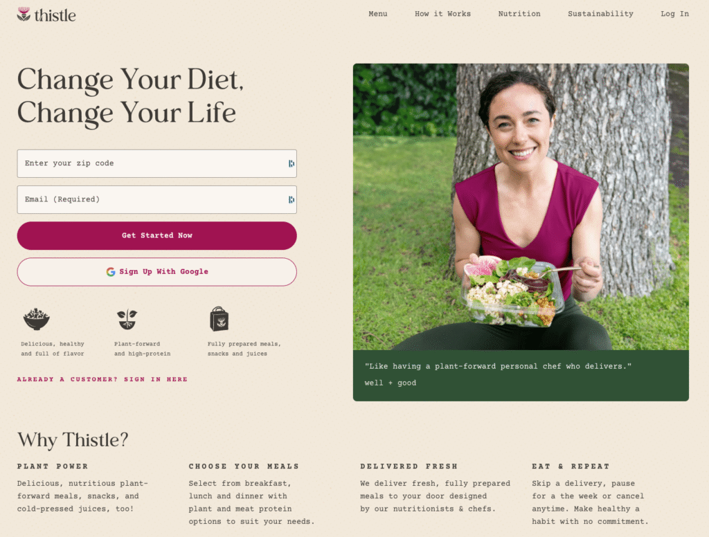 La page mise tout sur la simplicité : visuels lifestyle lumineux, ton positif, et un CTA unique “Subscribe Today” sans distraction. Le bloc produit renforce la personnalisation (choix du goût, fréquence, visuel immersif).