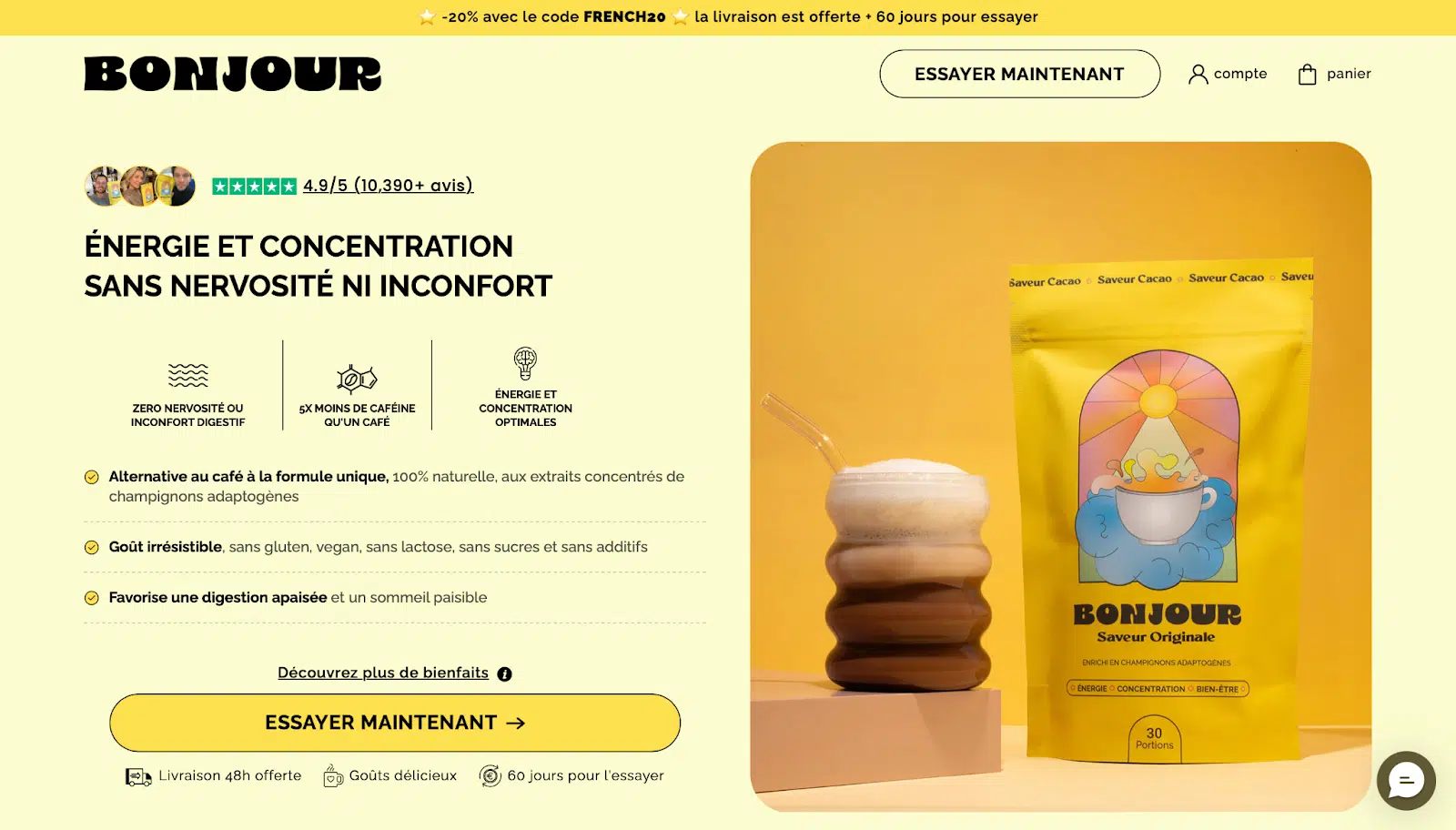 La marque fait simple : une offre découverte, un message transparent, et des preuves produit concrètes (2 250 mg de champignons adaptogènes par tasse). Pas de survente, juste une narration fluide et honnête.