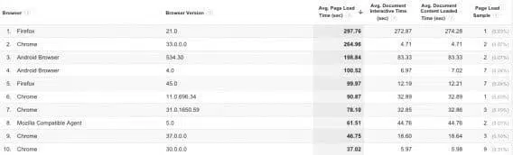 La vitesse de chargement de votre site a un impact très important sur l’expérience utilisateur. Vous devez chercher à l’optimiser. Ce rapport personnalisé permet d’analyser la vitesse de chargement de votre site en fonction des navigateurs et des versions de navigateurs.