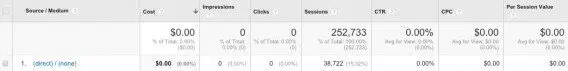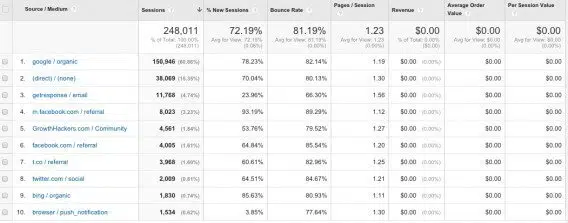 Si vous gérez un site e-commerce, ce rapport est très utile pour suivre votre activité au jour le jour. Ce rapport personnalisé est très basique, mais vous offre une vue générale sur vos performances e-commerce par source de trafic. Dans les métriques, nous vous conseillons d’ajouter le taux de conversion. Dans ce contexte, les métriques « average order value » (montant moyen des commandes) et « per session value » (montant par session) sont particulièrement puissants. Elles permettent de mesurer votre performance d’un point de vue financier et d’analyser les différences de comportement de vos clients en fonction des sources de trafic.