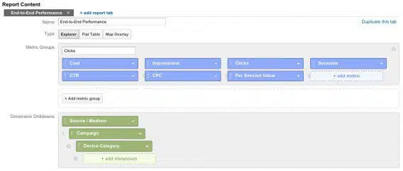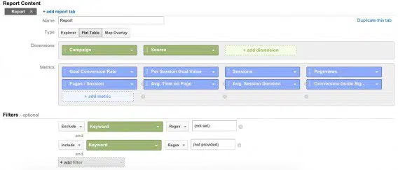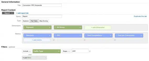 On a, dans cet exemple, utilisé des expressions régulières pour isoler les mots-clés de longue traîne. Sur le fonctionnement des « regex », lire notre article « Devenir un pro des expressions régulières« . Vous pouvez personnaliser les métriques du rapport. Ce rapport vous permettra de suivre la performance de vos mots-clés, y compris d’un point de vue financier. Il est très utile dans le cadre de la stratégie SEO.