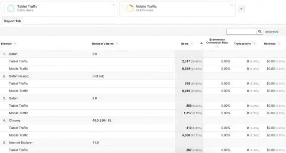 Ce rapport personnalisé Google Analytics permet d’analyser votre taux de conversion par navigateur et par appareil (device). C’est très utile d’un point de vue UX. Si un navigateur performe moins qu’un autre, c’est qu’il y a peut-être des problèmes d’affichage de votre site sur ce navigateur. De la même manière, si le taux de conversion est plus faible sur mobile, peut-être que l’expérience utilisateur sur ce device doit être optimisée.