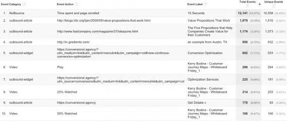 Dans ce rapport, il est intéressant de comparer les statistiques « Total Events » et « Unique Events ». Dans l’idéal, il faut qu’elles soient au maximum alignées. Sinon, il y a probablement un problème. De même, si un événement génère peut d’interactions, c’est qu’il faut revoir quelque chose. Pour bien comprendre le fonctionnement et le reporting des événements sur Google Analytics, nous vous renvoyons vers la documentation officielle de Google.