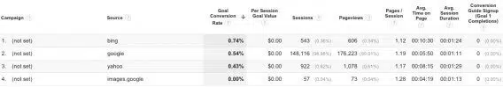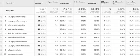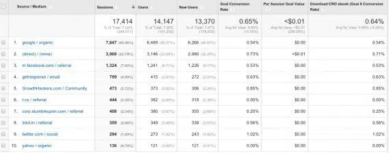 Remarque : lorsque vous aurez téléchargé ce rapport, il est possible qu’une des colonnes s’affiche mal : la sixième colonne, qui affiche le « Goal 6 » défini par Avinash et qui permet de mesurer l’engagement. Pour que cette colonne fasse remonter des résultats pertinents, vous devez définir un niveau d’engagement (exemple : X minutes passé sur le site, ou Y pages vues par session), créer un objectif pour ce comportement et ajouter cet objectif dans le rapport à la place de Goal 6.