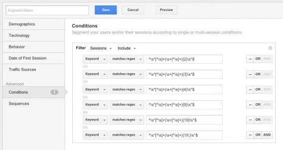 Si, dans le cadre de votre stratégie de référencement naturel, vous n’avez ciblé que 2 ou 3 requêtes, c’est que vous n’avez toujours pas compris le pouvoir de la longue traîne. Sur ce concept central du SEO, nous vous invitons à lire cet article de synthèse. Ce rapport personnalisé vous permet d’analyser l’évolution de vos 5, 10, 20 ou 30 requêtes de longue traîne. Pour construire le rapport, vous allez devoir créer un segment avancé (conditionne) :