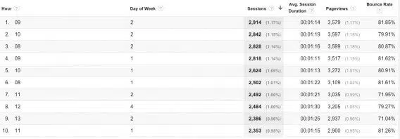 Le trafic sur votre site varie en fonction du jour de la semaine et de l’heure. Ce rapport personnalisé permet d’identifier les heures et jours qui totalisent le plus de trafic. Dans l’exemple ci-dessous, c’est le lundi (deuxième jour de la semaine dans le système US) à 9h que le trafic est le plus important.