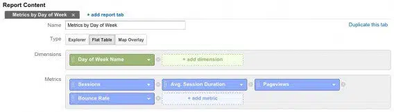 Pour créer ce rapport, vous devez utiliser le format « tableau statique » et configurer deux dimensions : jour de la semaine et heure. Vous pouvez, pour plus de personnalisation, ajouter de nouvelles métriques (colonnes) ou en supprimer.
