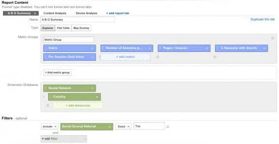 On dit souvent, non sans raison, qu’il est difficile de mesurer les réseaux sociaux. On parvient assez facilement à identifier combien de personnes arrivent sur le site via Facebook ou Twitter, mais il est plus difficile de dire dans quelle mesure ce trafic génère des revenus / des conversions. Le rapport personnalisé que nous vous présentons ici permet justement de répondre à cette problématique. Ce rapport est constitué de trois tableaux : un tableau « résumé », un tableau « analyse du contenu » et un tableau « analyse des devices ». La capture d’écran ci-dessous indique comment configurer le premier tableau.