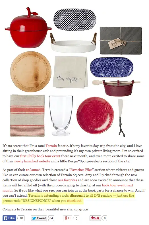 Le marketing d’influence est de plus en plus utilisé par les marques. Il consiste à nouer des partenariats avec des personnalités influentes (blogueurs, youtubers, célébrités…) afin de profiter de leur pouvoir de prescription et de leur audience. Dans le cadre de votre stratégie de marketing d’influence, vous pouvez proposer des offres exclusives réservées aux personnes qui suivent les influenceurs avec lesquels vous travaillez. Cette technique permet de convertir plus facilement l’audience de vos influenceurs. Dans l’exemple ci-dessous, Terrain propose un coupon de réduction de 15% aux personnes qui suivent les blogueurs partenaires. En l’occurrence, cette offre spéciale est intégrée à la fin d’un article sponsorisé. Cette stratégie permet de suivre les conversions en provenance des différents influenceurs et d’améliorer vos futures campagnes de marketing d’influence.