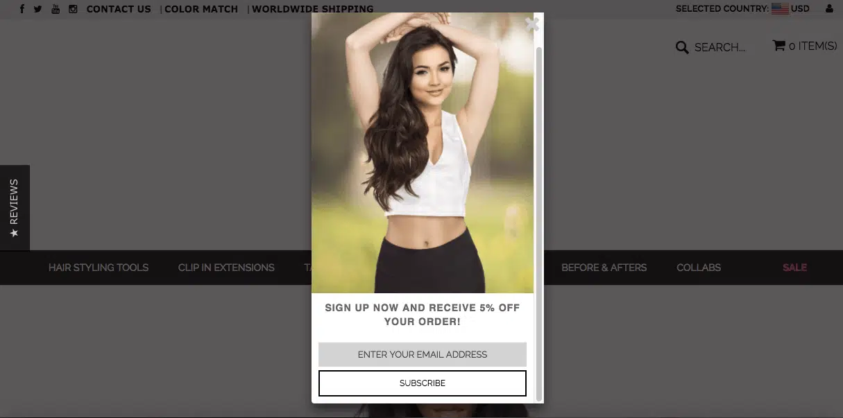 La newsletter reste un levier marketing important, mais elle est désormais souvent couplée à des campagnes automatisées et personnalisées via des plateformes de marketing automation, permettant d’adresser des messages plus ciblés et pertinents. De plus en plus d’e-commerçants proposent sur leur site l’inscription à la newsletter. Les offres spéciales peuvent être utilisées pour inciter les visiteurs de votre site ou clients à s’inscrire à votre newsletter. Bombay Hair, par exemple, offre 5% de remise en échange d’un abonnement à la newsletter. L’offre est proposée sous forme de pop-up.