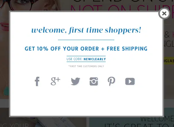Combien de visiteurs de votre site ecommerce convertissent et se transforment en clients ? 1% ? 3% ? Pour améliorer votre taux de conversion sur votre boutique en ligne, pourquoi ne pas proposer une offre spéciale incitant au premier achat ? Clearly Contacts offre à tous ses nouveaux visiteurs un remise de 10% et la livraison gratuite, en utilisant le format pop-up.