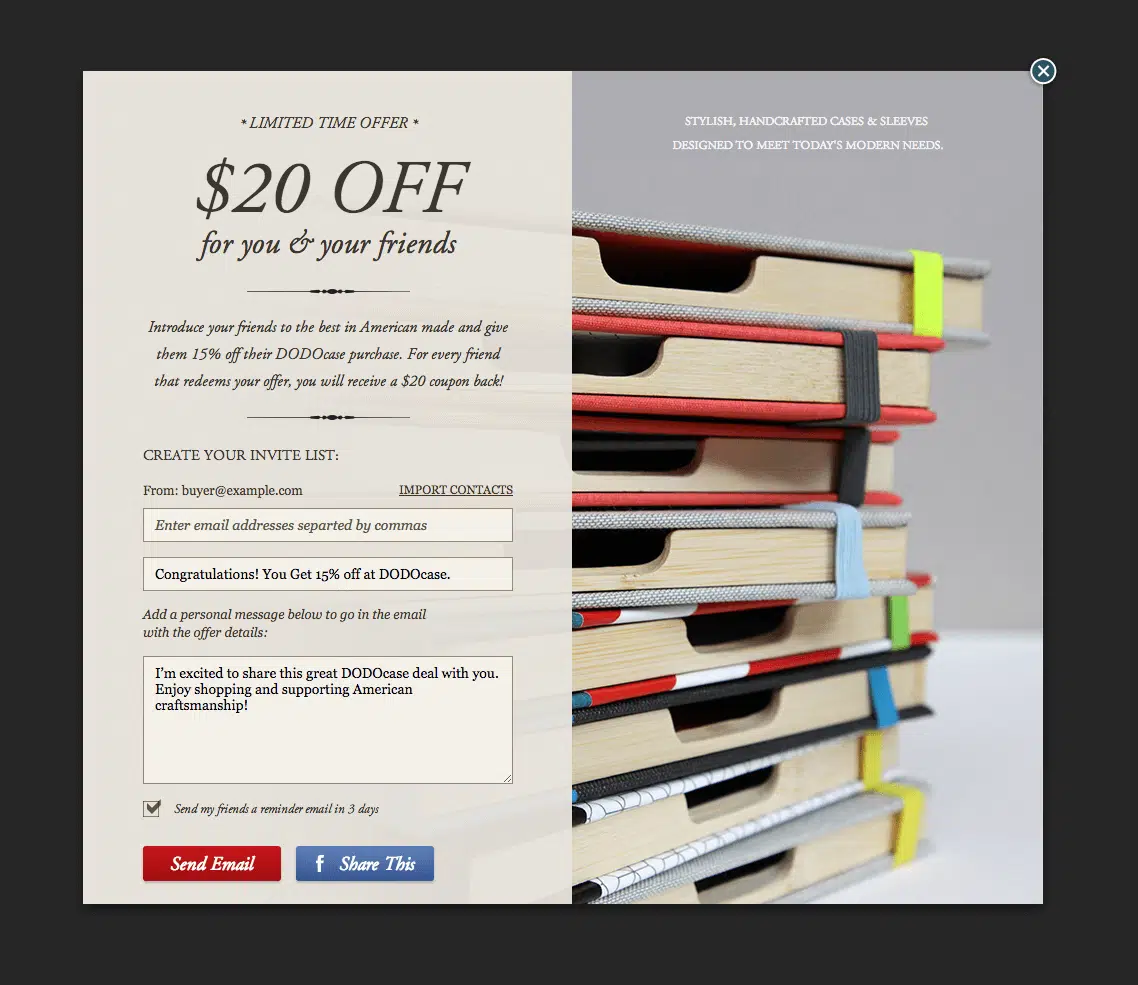 Sur internet, la recommandation joue un rôle essentiel. Une personne sera beaucoup plus incitée à acheter chez vous si vos produits et vos services lui ont été recommandés par un membre de son entourage (ami, famille, collègue…). D’où l’intérêt de développer des offres de parrainage. Vous avez le choix entre offrir le coupon uniquement à la personne qui recommande votre boutique, uniquement à la personne qui est recommandée, ou bien aux deux. Dans cet exemple, DODOcase, qui commercialise des accessoires de protection pour iPad, offre une remise de $20 aux personnes qui recommandent la marque, et une remise de $15 à chaque personne recommandée.