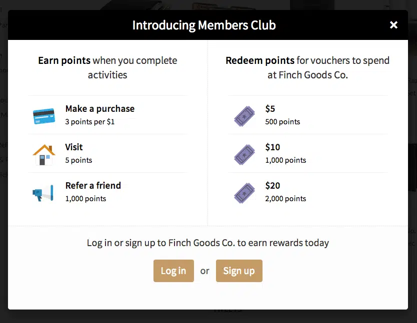 Si les offres spéciales sont idéales pour acquérir de nouveaux clients, elles peuvent aussi être utilisées pour fidéliser sa clientèle. L’idée est de récompenser les clients fidèles (ou en tous cas les clients qui ont déjà acheté une fois) en leur proposant des offres exclusives. Cela permet de renforcer la relation entre votre marque et vos clients. Finch Goods récompense ses meilleurs clients via un système de points convertibles en crédit sur le site.