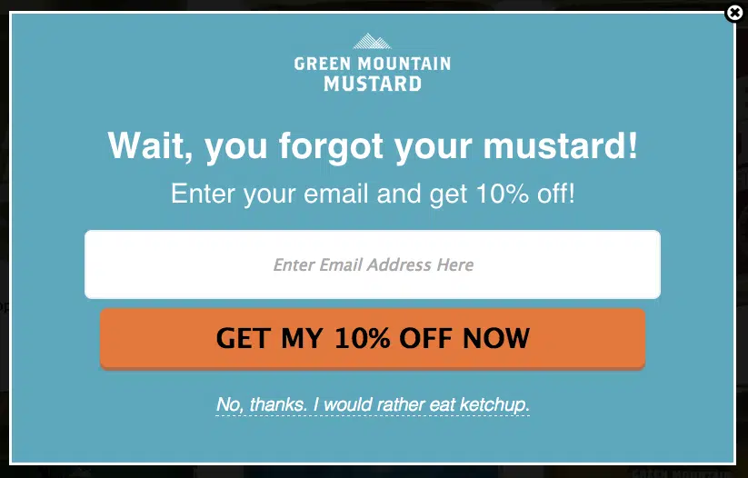 Un visiteur arrive sur votre site. Il navigue dans votre catalogue, consulte plusieurs pages produits mais décide finalement de quitter la page. Juste au moment où il s’apprête à cliquer sur la croix permettant de fermer la fenêtre de navigation, un pop-up s’affiche dans lequel la marque propose une offre spéciale. Ces pop-ups qui s’ouvrent alors que le visiteur est sur le point de quitter le site sont appelés « exit intent pop-ups ». Aujourd’hui, ils sont souvent enrichis par des solutions de personnalisation en temps réel, qui adaptent l’offre selon le comportement de navigation ou le profil du visiteur. Il suffit bien souvent d’une offre de dernière seconde pour convaincre le visiteur d’acheter. Dans l’exemple ci-dessous, Green Mountain Mustard propose 10% de remise aux visiteurs qui s’apprêtent à quitter le site.