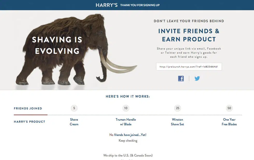 Les offres de pré-lancement permettent de générer du trafic et de développer l’intérêt de votre cible. Elles peuvent être utilisées dans le cadre du pré-lancement d’un produit ou même de la création de votre entreprise. Dans l’exemple ci-dessous, Harry’s (un site e-commerce spécialisé dans les produits de rasage) offre un produit gratuit à toutes les personnes qui ont partagé le lien de la marque avant son lancement (via Facebook, Twitter ou par email). Cette stratégie originale a permis à Harry’s d’obtenir 100 000 abonnés à la newsletter avant même le lancement du site.