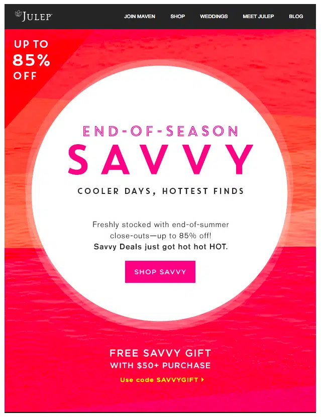 Noël, Nouvel an, Saint-Valentin, Pâques : ces fêtes sont souvent associées à des pics de ventes en ecommerce. Proposer des offres spéciales au moment de ces dates stratégiques vous permettra de booster vos ventes. Vous pouvez aussi utiliser des offres spéciales à l’occasion des vacances scolaires pour augmenter vos revenus. Julep, une enseigne de produits de beauté, a l’habitude de proposer à ses clients des coupons et des codes promos au moment des fêtes et des vacances scolaires.