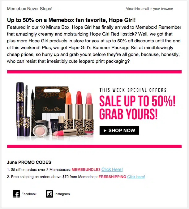 Cette stratégie promotionnelle traditionnelle permet de générer des ventes. Souvent les promotions sont envoyées à la fin du mois ou même à la fin du trimestre. Memebox, par exemple, propose chaque semaine des remises et des codes promos tous les mois (voir en bas de l’email).