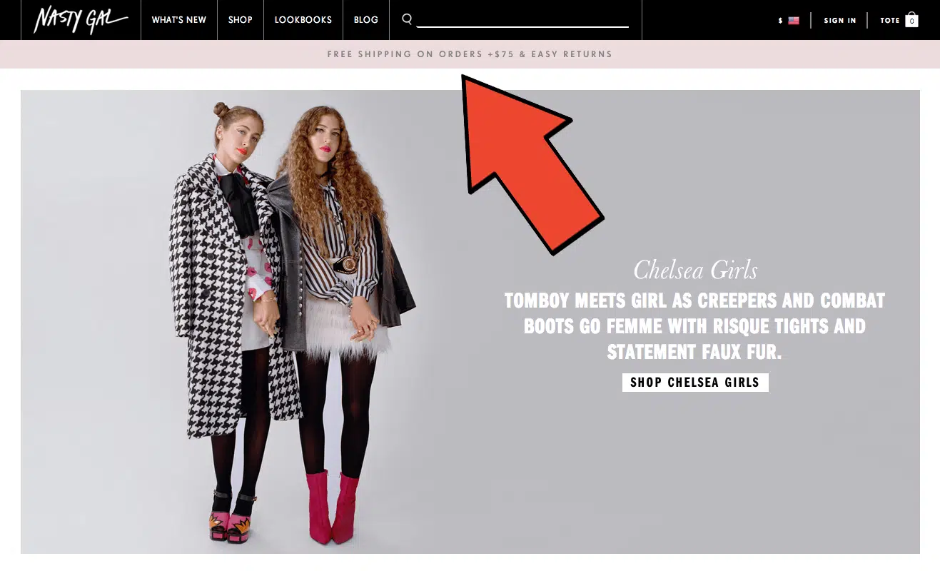 Les offres basées sur la taille du panier encouragent les clients à dépenser plus. Ces derniers sont incités à ajouter des produits à leur panier pour bénéficier de l’offre. C’est une technique très efficace pour augmenter la valeur du panier moyen (un KPI très important en ecommerce). Exemple : « 10% de remise à partir de 120 euros d’achat ». Astuce : analysez le panier moyen sur votre site à l’aide d’outils d’analyse avancés (souvent intégrés aux plateformes ecommerce modernes) et proposez des offres personnalisées, par exemple via des moteurs de recommandations ou des systèmes de segmentation dynamique, pour cibler les clients susceptibles d’augmenter leur panier. Nasty Gal offre les frais de port pour toute commande supérieure à $75.