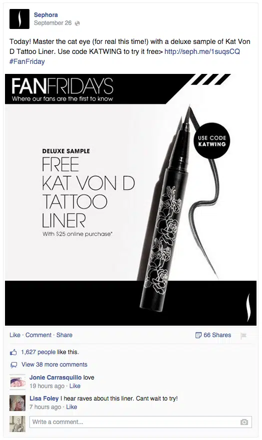 Comme nous l’avons vu, les offres peuvent être proposées directement sur le site (sous forme de pop-up notamment) ou bien par email. Mais il peut être intéressant aussi de créer des offres exclusives sur les réseaux sociaux. L’objectif, en faisant cela, est de renforcer la relation que vous entretenez avec les personnes qui vous suivent sur Facebook, Twitter, etc. et d’encourager d’autres personnes à vous suivre. La célèbre enseigne Sephora publie régulièrement des offres exclusives sur son compte Facebook. Dans cet exemple, la marque offre aux abonnés Facebook un cadeau pour tout achat supérieur à $25.