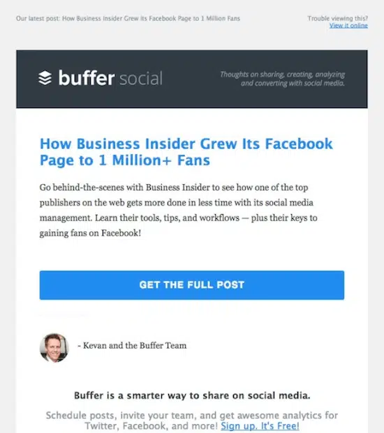 Si vos produits ou vos services se connectent à d’autres produits ou services, ou sont utilisés par des marques importantes, profitez-en : vous avez une belle opportunité d’améliorer votre image de marque en vous appuyant sur celle de vos partenaires. Buffer par exemple propose dans ses emails des études de cas de gros clients. Dans l’exemple ci-dessous, l’email explique comment Business Insider est parvenu à développer sa présence sur Facebook grâce à Buffer.