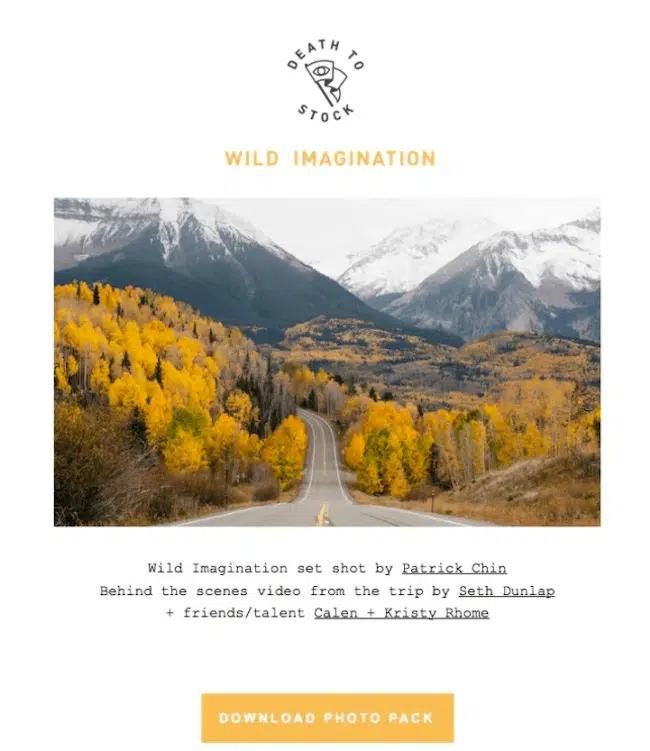 L’email reste une plateforme privilégiée pour l’échange de fichiers et de contenus téléchargeables. Aujourd’hui, il est courant d’intégrer des liens de téléchargement ou d’accès à des ressources (livres blancs, guides, vidéos, etc.) directement dans les emails marketing, ce qui augmente leur utilité et leur valeur perçue. La plupart des emails de nature marketing ne contiennent pas de liens de téléchargement, parce qu’ils se focalisent sur le contenu du message, sur les CTA et le design. C’est dommage, car proposer un lien de téléchargement dans vos emails peut vous permettre de rendre vos emails plus « utiles » et d’augmenter leur valeur. « Death to the Stock Photo » l’a très bien compris. Ce site n’envoie qu’un seul email par mois à sa liste d’inscrits, mais dans tous ses emails figure un fichier téléchargeable contenant des images de qualité. Non seulement ces emails sont visuellement très bien conçus, mais en plus ils ont une vraie utilité.