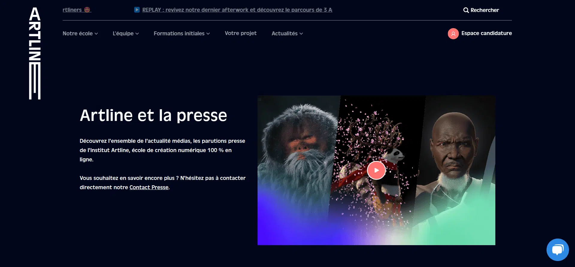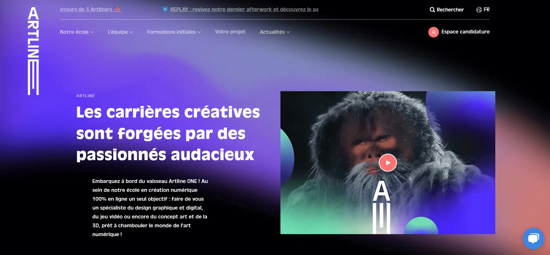L’Institut Artline est une entreprise spécialisée dans la formation professionnelle dans le domaine de la création graphique numérique. Situé en France, cet institut propose des formations en présentiel et en ligne, ainsi que des certifications pour les professionnels du secteur. Le site internet de l’Institut Artline est bien structuré, et dynamisé par l’moniprésence de vidéos. La page d’accueil présente les offres de formation ainsi que les témoignages des étudiants et les différents partenaires du centre de formation.