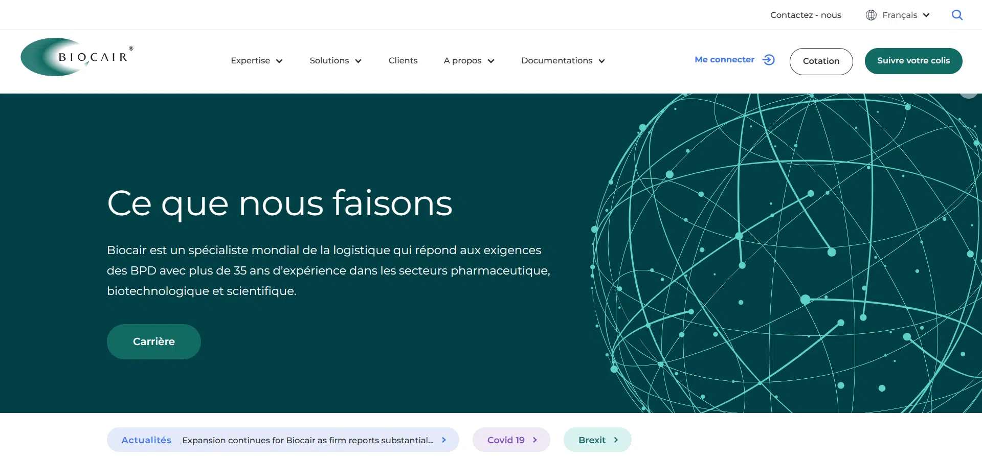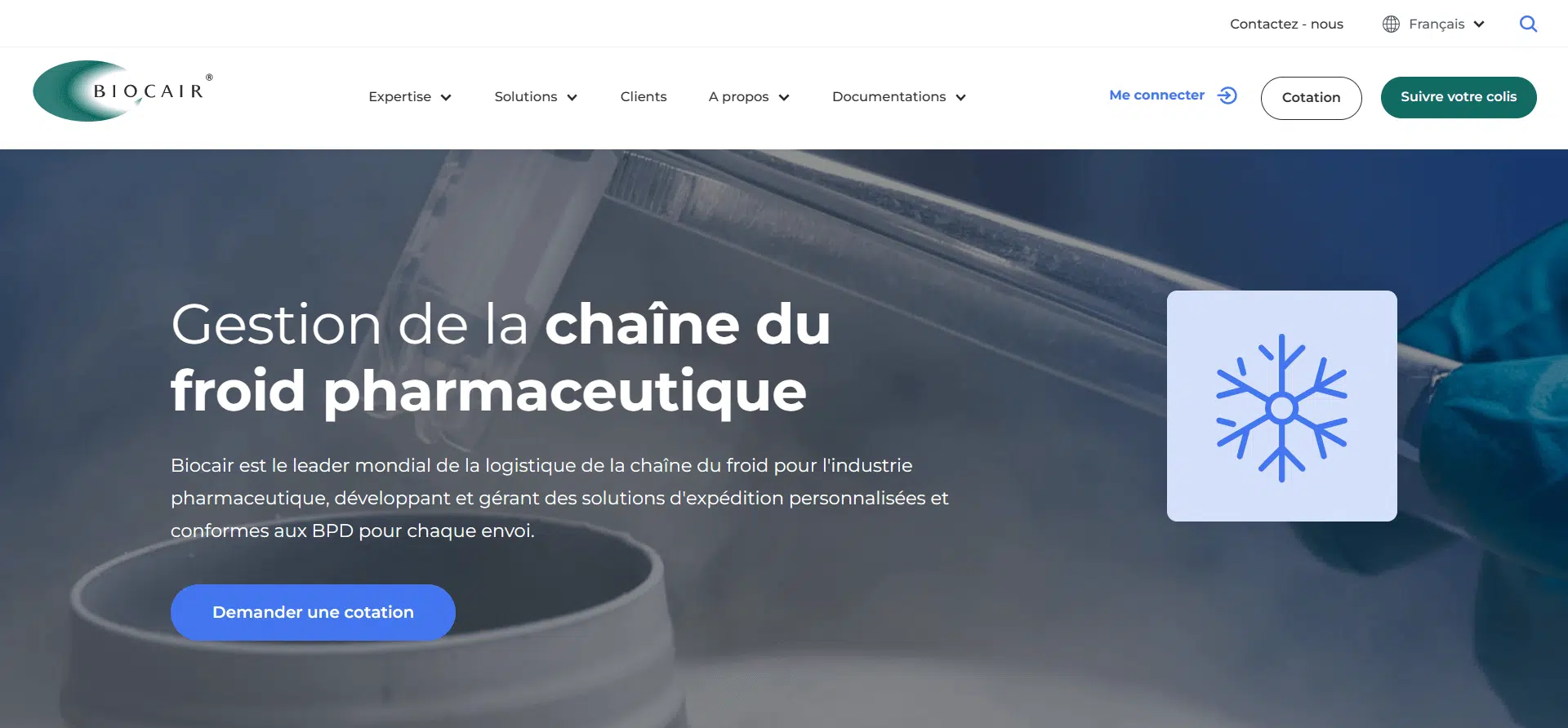Biocair est une entreprise spécialisée dans la logistique de transport d’échantillons biologiques et de produits pharmaceutiques dans le monde entier. En ce sens, le site de Biocair est traduit en Anglais, en Français et en mandarin. Sa page d’accueil met l’accent sur son savoir-faire et sur le nombre de pays desservit. Ce qui permet à ses clients de savoir immédiatement qu’ils peuvent faire appel à cette entreprise de logistique pour livrer leurs produits n’importe où dans le monde.