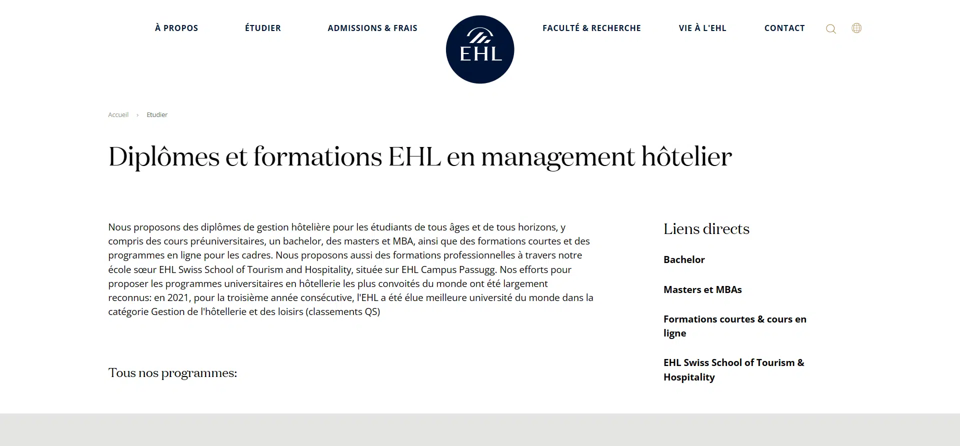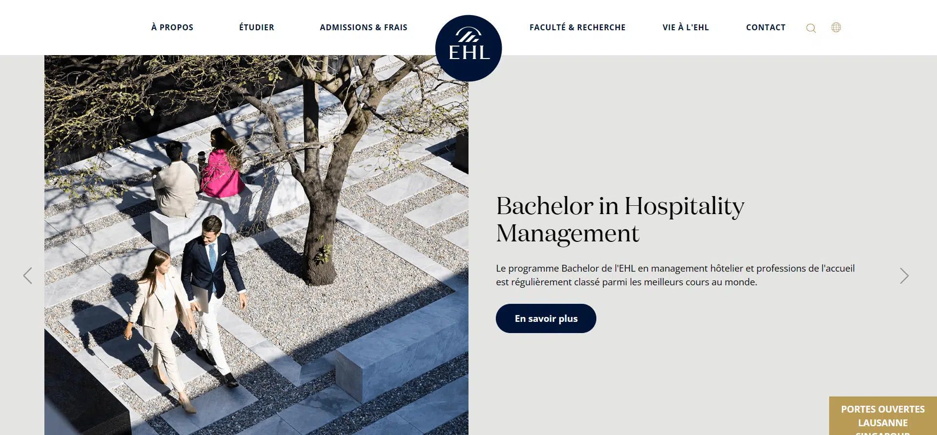 L’école hotellière de Lausanne est un acteur majeur dans le domaine de la gestion de la formation en hôtellerie. Elle a placé l’innovation au centre de ses programmes de formation depuis sa création en 1893, et elle propose désormais la digitalisation de ses cours et services. Afin de répondre aux besoins spécifiques de ses équipes marketing, EHL a développé un site internet qui met l’accent sur les informations clés, et encourage les interactions. Pour attirer toujours plus de nouveaux candidats, EHL optimise sans cesse ses performances SEO grâce à différentes pages régulièrement mises à jour comme celle dédiée à la « vie à l’EHL ».