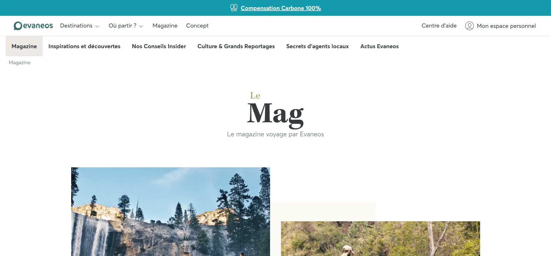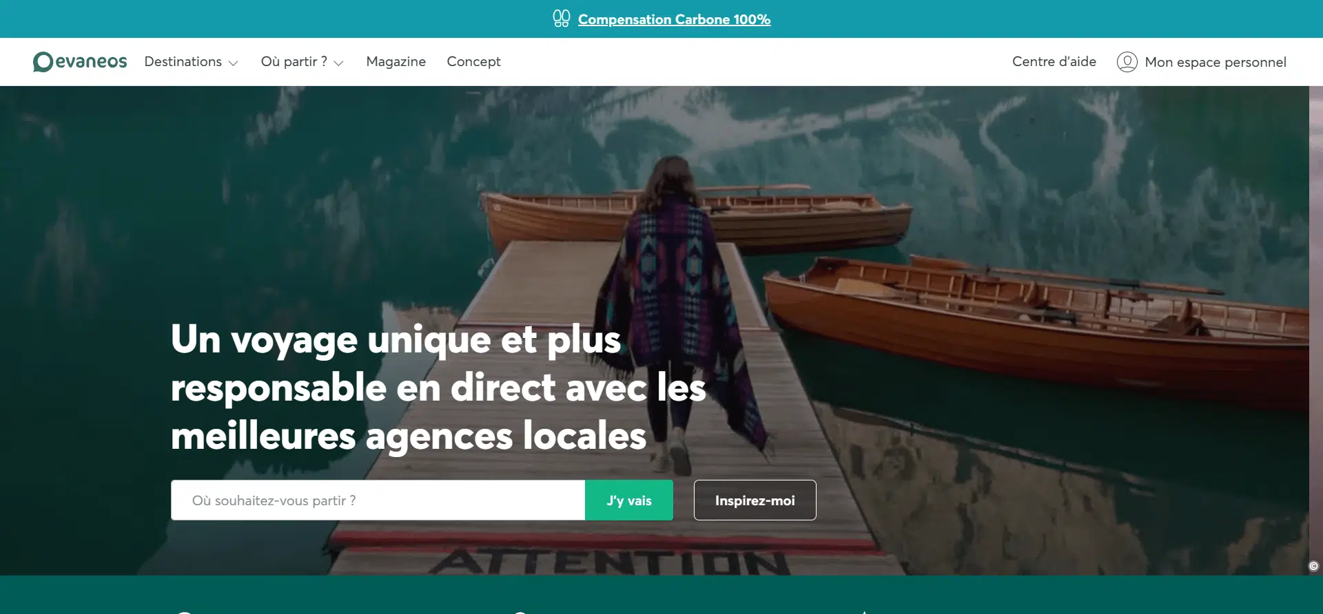 Evaneos est une plateforme de voyage en ligne qui permet de concevoir et de réserver des voyages sur mesure dans plus de 160 destinations à travers le monde. Le site Evaneos facilite la recherche à l’aide d’une barre de recherche centralisée sur la page d’accueil et un menu déroulant pour choisir une destination. Il permet ensuite de personnaliser votre voyage par l’ajout d’activités et des centres d’intérêts, ainsi qu’un budget moyen.