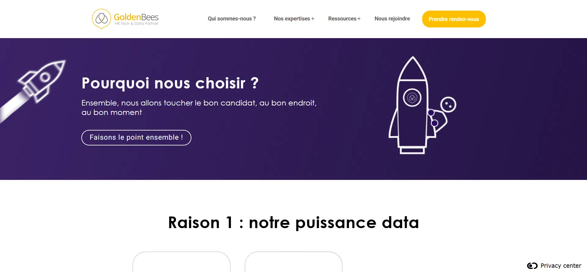 Pour attirer des candidats et de nouveaux leads qualifiés, Golden Bees a choisi le CMS d’HubSpot qui lui permet de définir une architecture de site et une personnalisation du contenu propice au SEO et à la collecte de données. L’utilisation d’illustrations animées, l’incrustation de vidéos, des CTA bien placés, et des photos de l’équipe sont autant d’exemples d’éléments intéressants qu’HubSpot CMS leur a permit de mettre en place sur leur site internet.