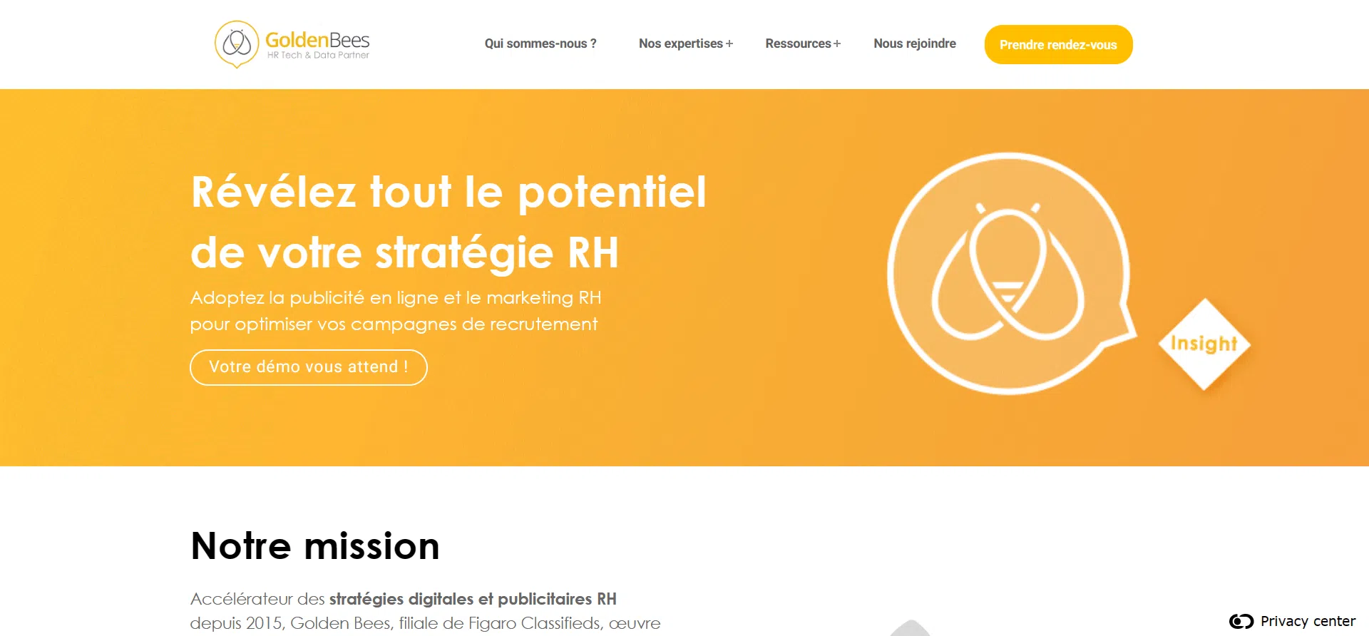 Golden Bees est une entreprise qui a pour objectif de placer les ressources humaines au centre de la performance des entreprises. Elle intervient dans le domaine du conseil média, technologique et de l’analyse de données RH. Golden Bees se spécialise dans l’optimisation de la digitalisation et de l’organisation de la chaîne de recrutement des entreprises.