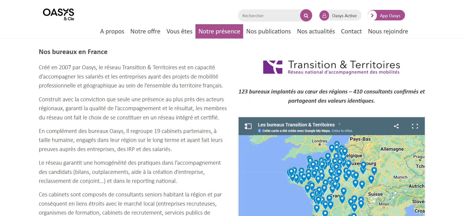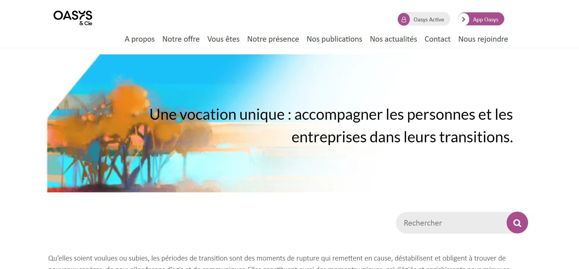 Oasys Consultants est un cabinet de conseil, pluridisciplinaire, composé d’experts, consultants et coachs spécialisés qui accompagnent dirigeants, managers et collaborateurs dans leurs évolutions professionnelles et les transformations de leurs organisations. Son site est sobre, et sa barre de menu et la barre de recherche vous permettent de trouver les services qui vous correspondent.