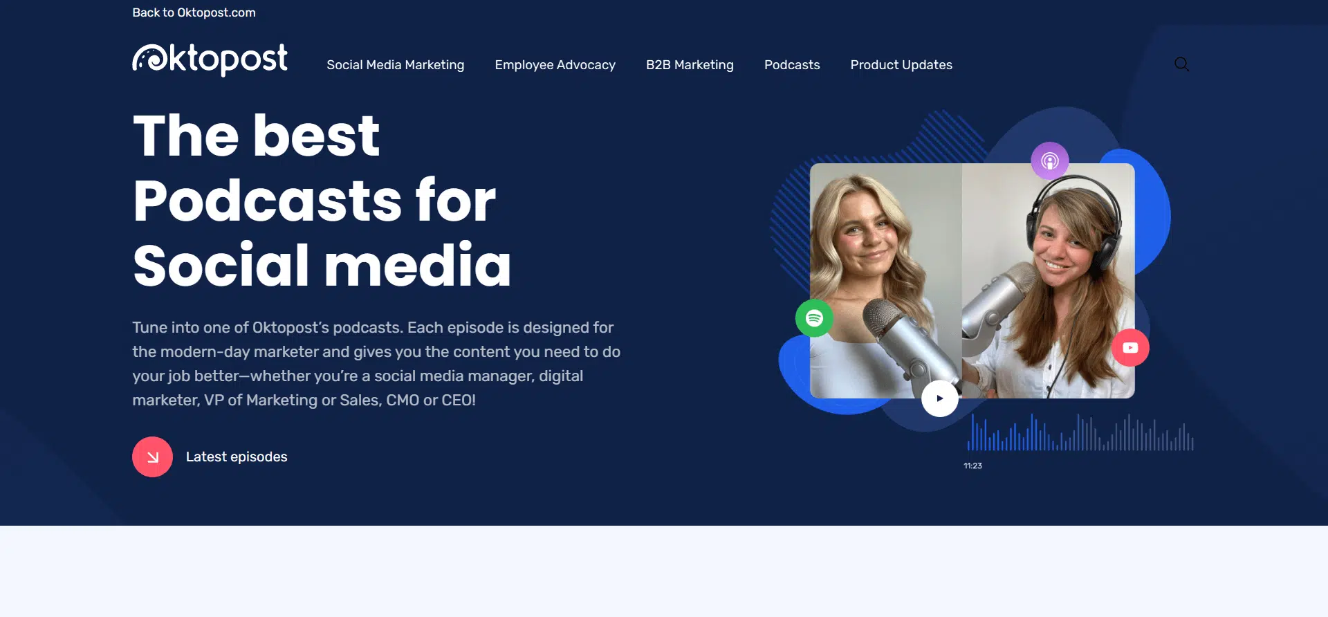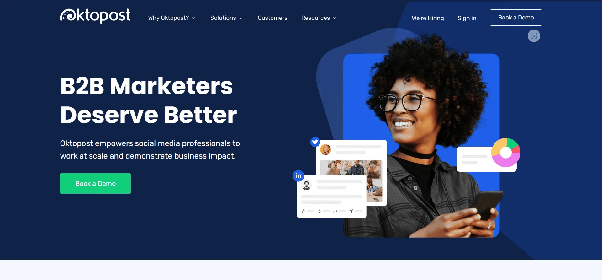 Oktopost est une plateforme de gestion de médias sociaux destinée aux entreprises. Elle permet de planifier, publier et analyser des contenus sur différentes plateformes sociales telles que Facebook, Twitter, LinkedIn, Instagram, YouTube et d’autres encore. Sur son site on retrouve les essentielles références clients, les services proposés et un centre de ressources bien fourni (blog, centre d’aide, webinairs, etc…). Vous accédez également rapidement aux coordonnées des agences partenaires capables de développer les solutions proposées au sein des entreprises clientes.