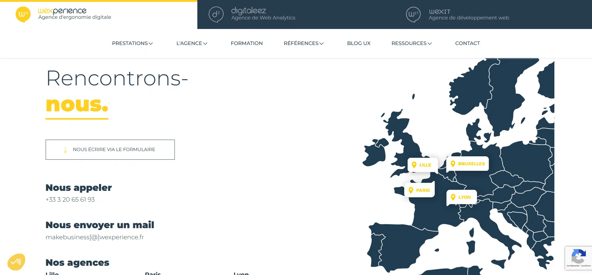 Fidèle à leur niveau d’expertise, Wexperience propose un site clair, où la navigation est intuitive et interactive. Les pages sont agrémentées d’icônes animées qui illustrent avec dynamisme les informations partagées. Dès la page d’accueil, on retrouve les adresses des 3 principales agences françaises, ainsi que leurs coordonnées. La page de contact rappelle également les adresses des différentes agences, leurs numéros de téléphone et donne la possibilité au visiteur d’envoyer un message directement via le formulaire présent en bas de page.
