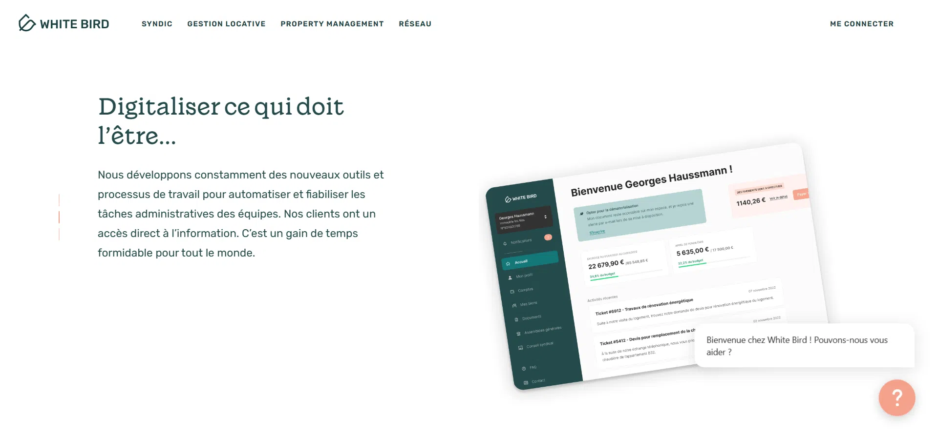 En plus de ces éléments de base, White Bird vous permet de les contacter directement par live chat, d’accéder au support client en ligne, et d’obtenir des informations pertinentes via leur blog. Pour leurs clients, White Bird propose également un accès à un espace client personnalisé, où les clients peuvent échanger des documents et des informations avec l’agence, payer vos factures en ligne ou visualiser l’état des loyers (payés ou en attente par exemple).