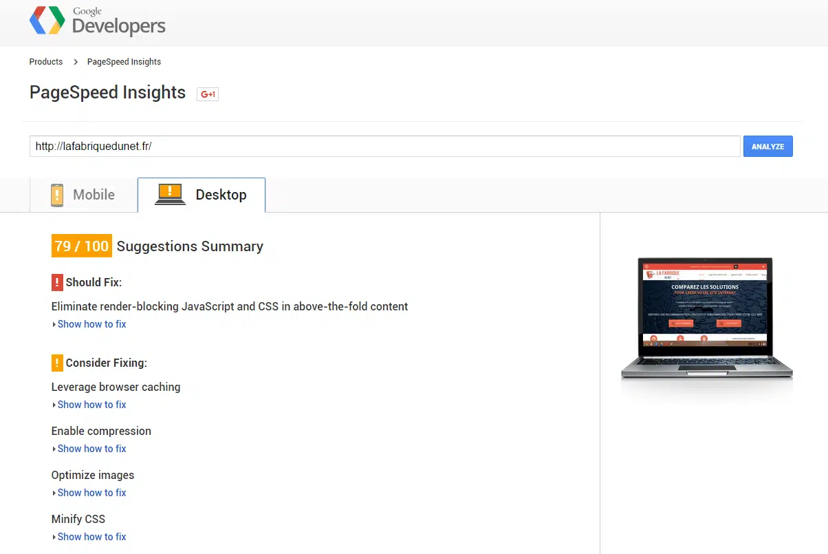 Le service de test de performance de Google, PageSpeed Insights, est l’un des outils de référence. Ce service permet d’obtenir une évaluation « objective » de la vitesse de chargement de votre site à la fois sur mobile et sur ordinateur. Les performances d’un site sont en effet souvent variables suivant les terminaux utilisés, la location des serveurs, etc. Autre avantage de PageSpeed Insights : le service vous donne des conseils personnalisés, classés par ordre de priorité, pour remédier aux éventuelles défaillances repérées lors du test (concernant le poids de vos images, la gestion des fichiers JS et CSS, la mise en cache, etc.).