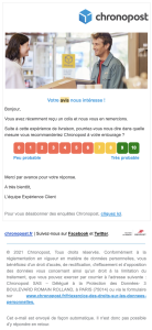 Chez Chronopost, on ne s’embarrasse pas d’un roman. L’objet de l’e-mail est clair, le message est bref, l’échelle de 0 à 10 s’affiche immédiatement, avec un dégradé visuel du rouge au vert.