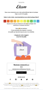 Etam mise sur un visuel simple mais efficace : une échelle de satisfaction en couleurs, de “pas du tout satisfait” à “très satisfait”. Le tout intégré dans un e-mail épuré, qui va droit au but.