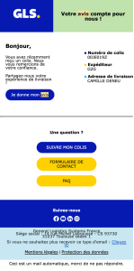 GLS envoie un e-mail post-livraison clair et lisible. Ce qui fonctionne ici, c’est l’organisation en deux blocs : à gauche, les infos du colis ; à droite, l’action attendue.