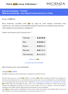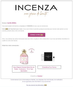 Incenza reprend une mécanique classique mais qui fonctionne bien : rappeler le ou les produits achetés, puis proposer un retour simple via un partenaire d’avis certifié.