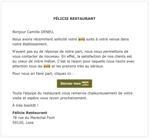 Premier e-mail : une invitation à donner son avis après le repas. Deux jours plus tard, une relance bienveillante : “Nous lisons tous les avis avec attention.” Rien d’agressif, juste une piqûre de rappel avec tact.