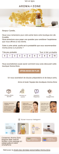 Aroma-Zone ne cherche pas juste une note, elle prolonge l’expérience client. L’email ouvre avec un NPS simple et visuel, puis glisse vers un tunnel relationnel : “Dites-nous en plus”, diagnostic beauté, contenus personnalisés, lien vers Instagram.