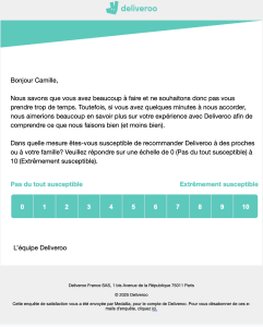Deliveroo ouvre le dialogue avec empathie : “on sait que vous avez beaucoup à faire”. Un début qui désamorce d’emblée l’objection du temps. Le paragraphe central explique : “dites-nous ce qui fonctionne (ou pas)”. Pas de bla-bla, que de l’action.